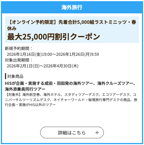 HISの公式サイトには、常時更新されているクーポン専用ページがあります。