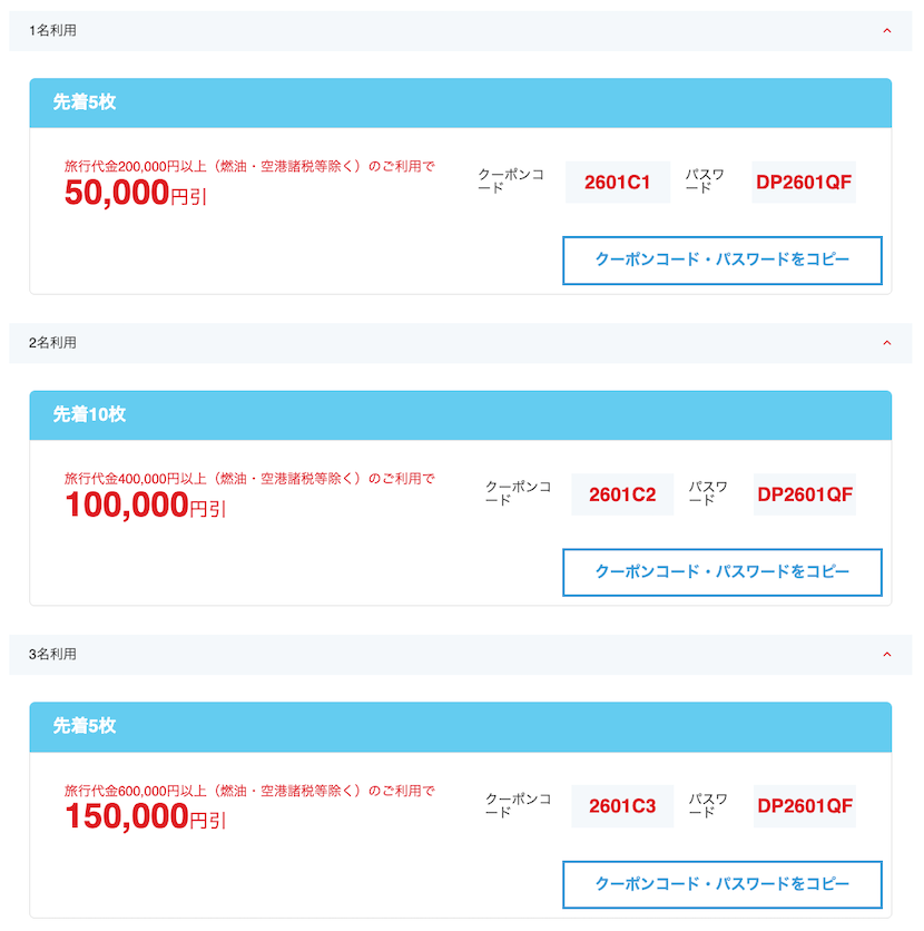 JTBでは、予約人数に応じて割引額や割引率が高くなるクーポンが配布されています。