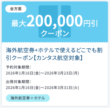 宿泊のみ、航空券付きツアー、家族旅行向けなど、目的に合ったクーポンを選びやすい点が魅力です。