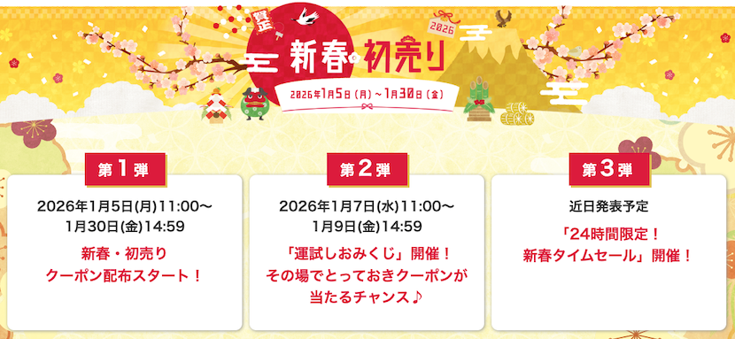 第1弾では、2026年1月5日11:00~1月30日14:59まで、国内最大7,000円・海外最大3万円のクーポンが配布されます。