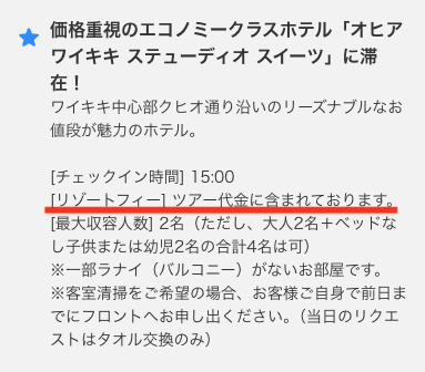 一方、航空券とホテルを自由に組み合わせて予約できるダイナミックツアーでは、リゾートフィーが別途請求されるのが一般的です。