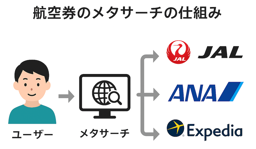 メタサーチとは、ユーザーが入力した条件に基づき、各航空会社や予約サイトの情報を集めて一覧表示する仕組みを指します。