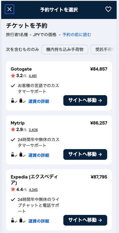 複数の航空会社や旅行代理店の料金をまとめて確認できるため、効率よく最適な航空券を見つけることができます。