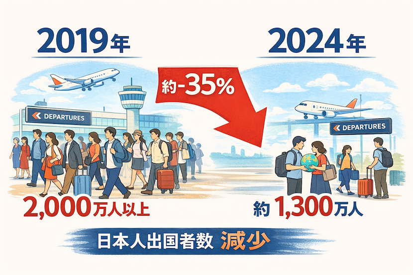 日本の海外渡航者数は、2019年の約2,008万人から2024年の約1,300万人へと減少しており、約35%の落ち込みとなっています。